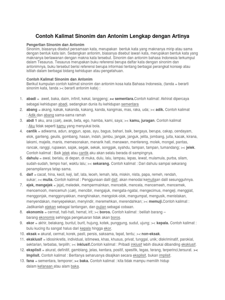 Contoh Kalimat Sinonim Dan Antonim Lengkap Dengan Artinya Pdf